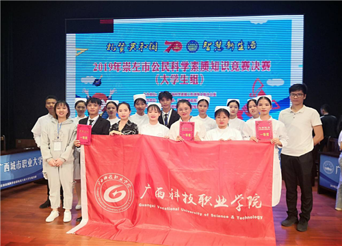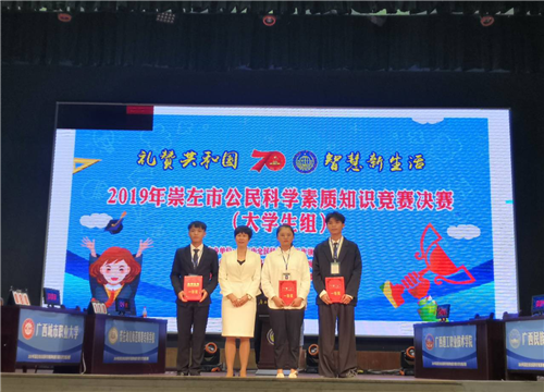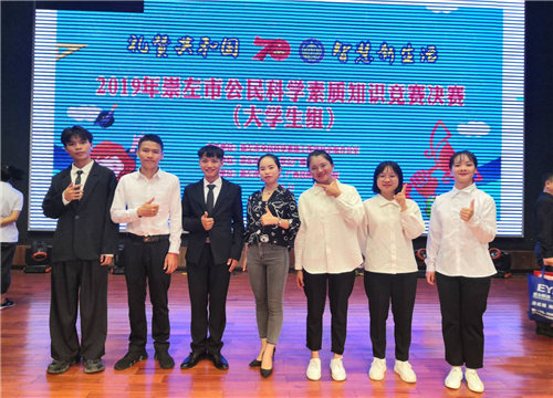 2019年11月7日上午,2019年崇左市公民科学素质知识竞赛决赛(大学生组)在广西民族师范学院音乐厅隆重举行。我校吴长岭、罗慧敏、陈嘉烨三位同学组成的学校代表队在决赛中以优异的成绩取得第一!