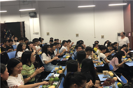 随着活动的正式开始,同学们开心地欢笑交谈,互相分享桌子上的美食,气氛友好而热烈。